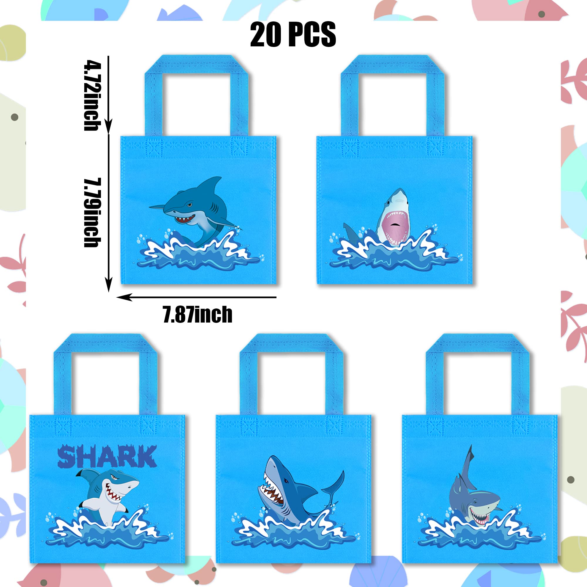 - Package Included: You will get 20 non-woven gift bags with shark patterns. It contains 5 kinds of sharks with different patterns. These patterns are clearly printed and numerous enough for you to use at the party.