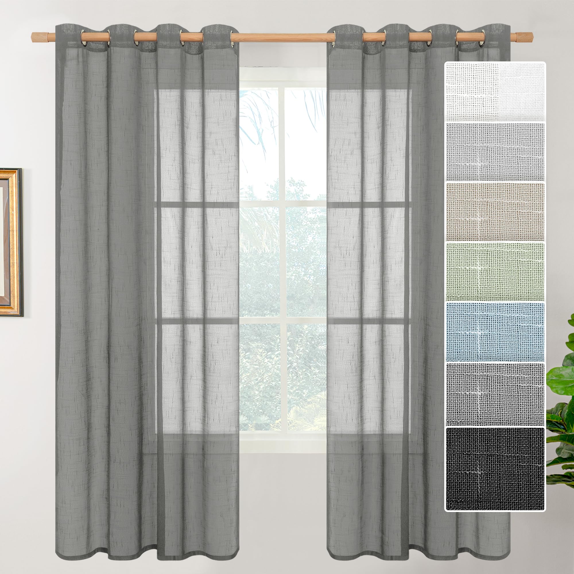 - Transform your living room into a cozy haven with our 2-panel set of textured faux linen dark grey sheer curtains. Each panel measures 132 cm wide by 182 cm long, making them perfect for most windows. The curtains come with 8 silver metal grommets on top, making it easy hanging on curtain rods less than 4 cm in diameter and slide smoothly. These curtains are an ideal choice to enhance the ambiance of your living room decor.