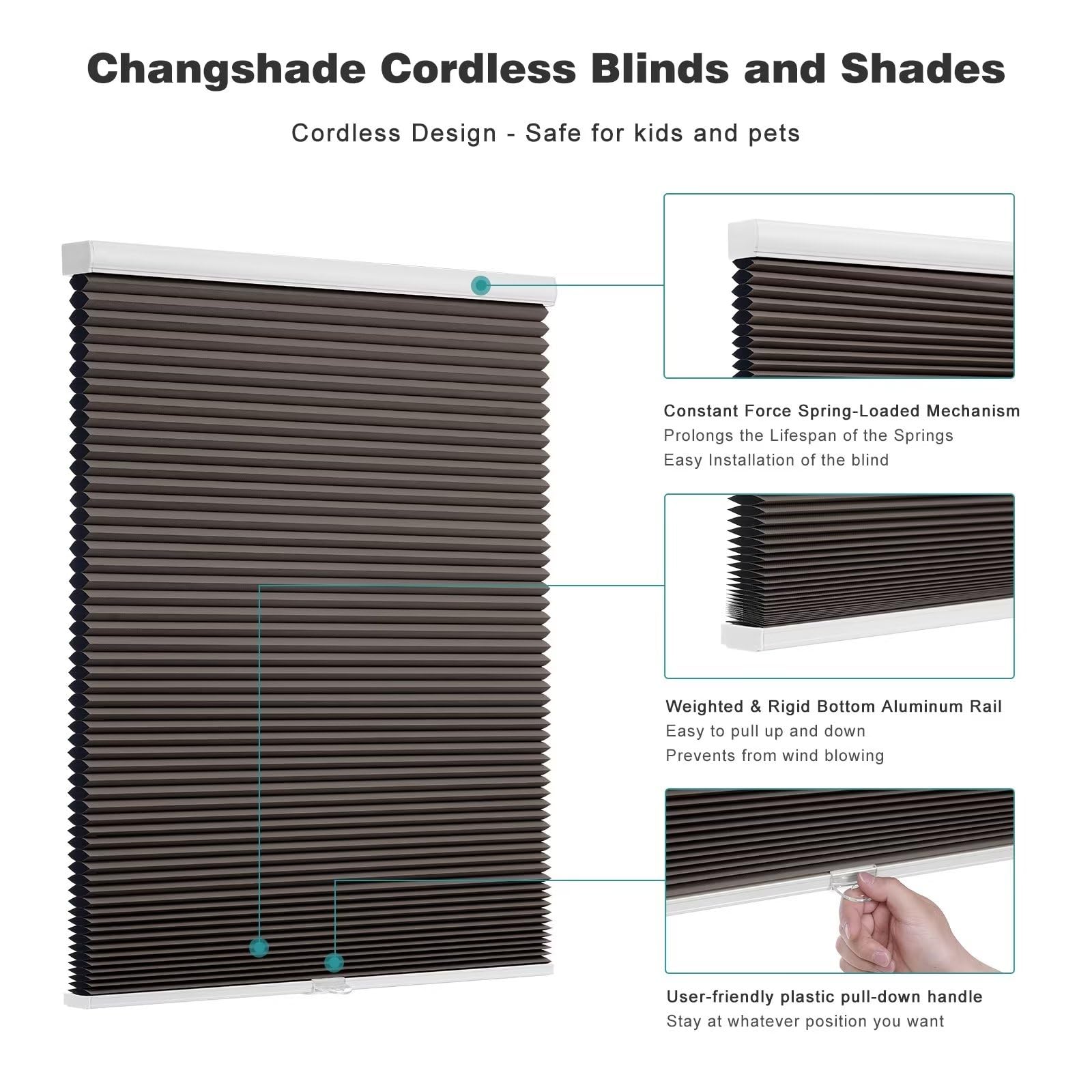 - SMOOTH & QUIET GLIDE: Changshade robust constant force spring-loaded mechanism has passed 5,000 times usual lifting or pulling down tests for each blind and makes it easy to raise and lower the blind evenly every time and stay balanced automatically; it retracts and extends smoothly with constant force; our patented spring winder inside prolongs the lifespan of the springs, avoids the rebound or sagging performance and simplifies the mount of the blind