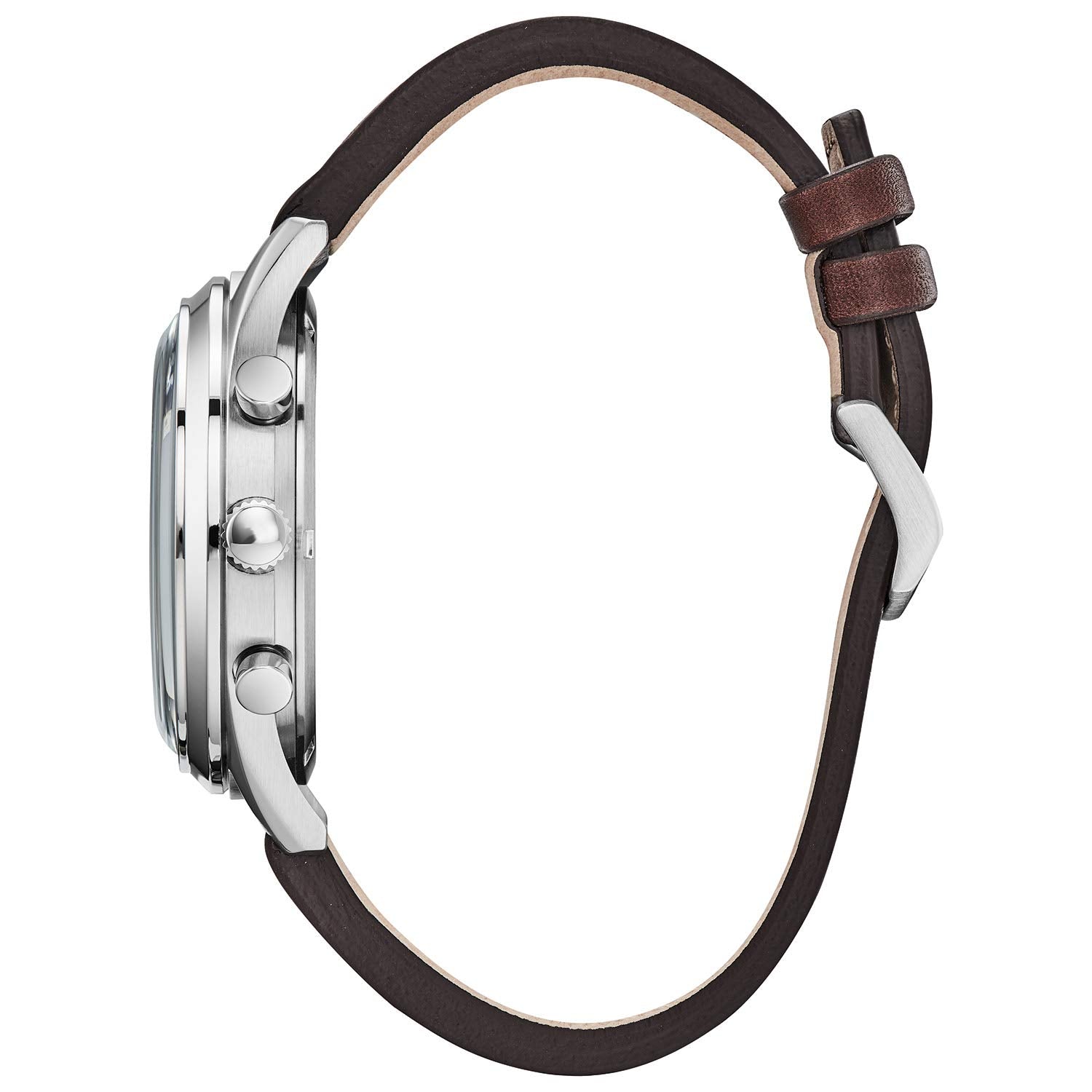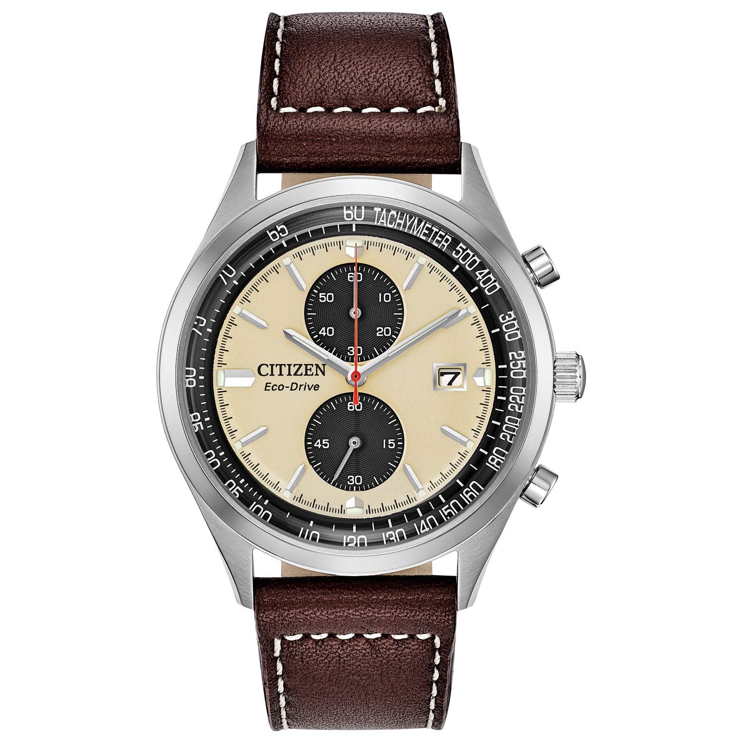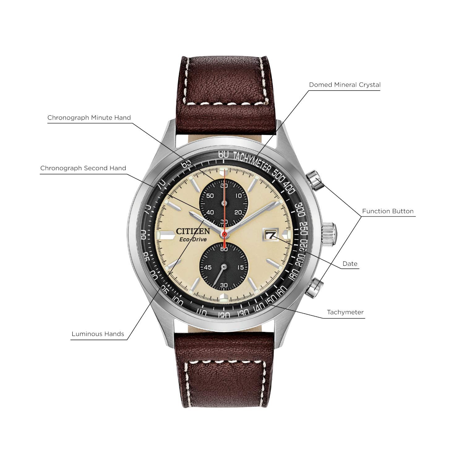 Citizen Eco-Drive™ FAQ Watch Sizing Guide Meld classic style with your modern fashion wearing the Citizen Watches® Chandler watch. Round stainless steel case. Adjustable brown calfskin leather strap with contrast stitching. Three-hand analog display with quartz movement. Chronograph functionality (30 minute counter, 1/10 second counter, central 60-second chronograph hand, add and split functions). Using the most advanced technology in watch making, the Eco-Drive technology never needs a battery. Beige with black constrast dial face features stick index hour markers, two-subdials, date display window, minute track at perimeter, and brand name. Dial ring features tachymeter. Water resistant up to 10 ATM/100 meters. Presentation box included. Made in Japan. Citizen Watch offers a five-year limited manufacturer's warranty on all their products. For more information, please visit their website and see the "Service Information" section. Measurements: Case Height: 43 mm Case Width: 43 mm Case Depth: 14 mm Band Width: 22 mm Band Circumference/Length: 9 in Weight: 2.6 oz