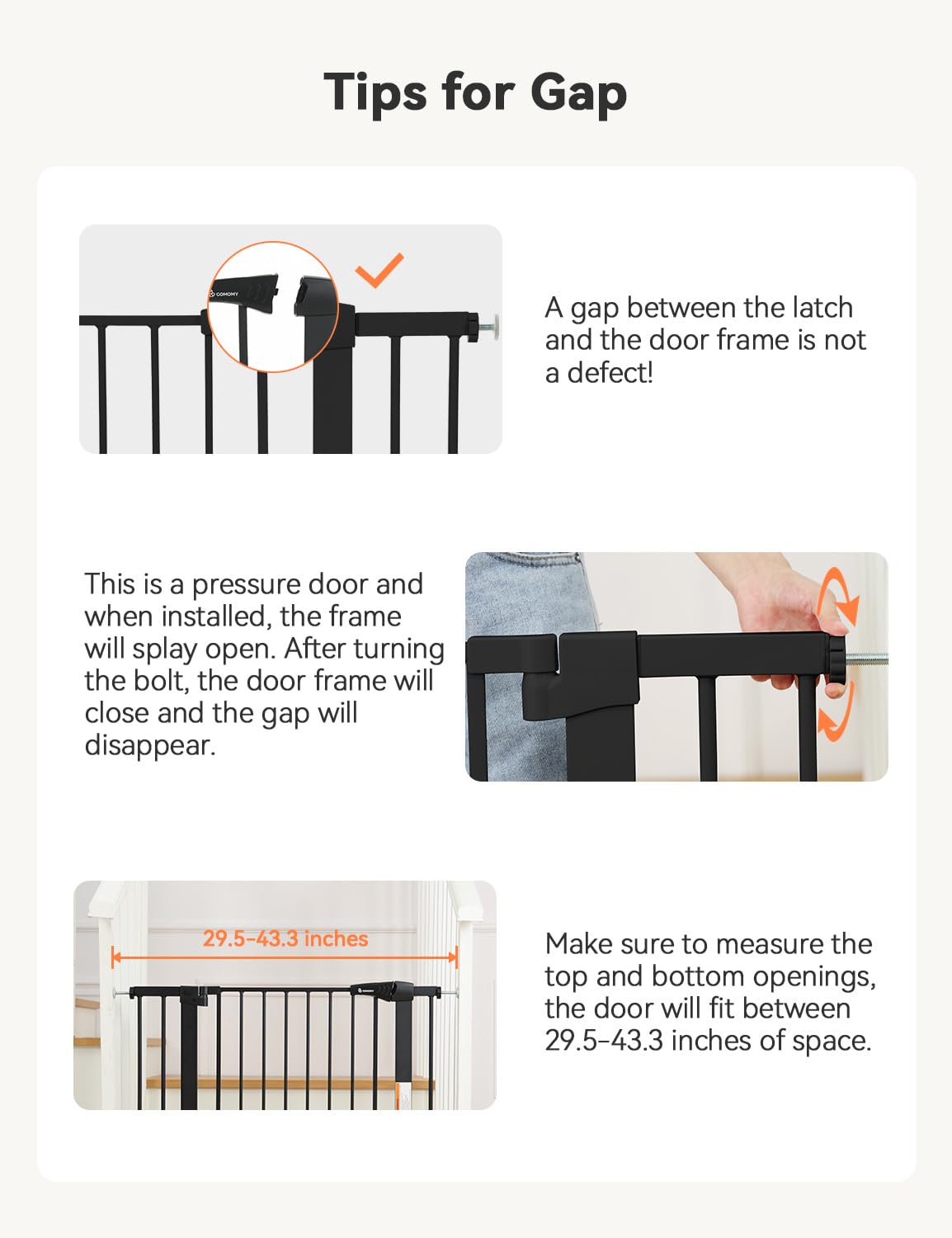 - Large & Extra Wide - Fits openings 29.5-43.3 inches Wide. Stand 30 inches tall. Ideal for doorways, hallways, the bottom of stairs, kitchens, laundry rooms, bedrooms, and playrooms. Notice: Must measure your openings before purchasing this extra wide gate.
