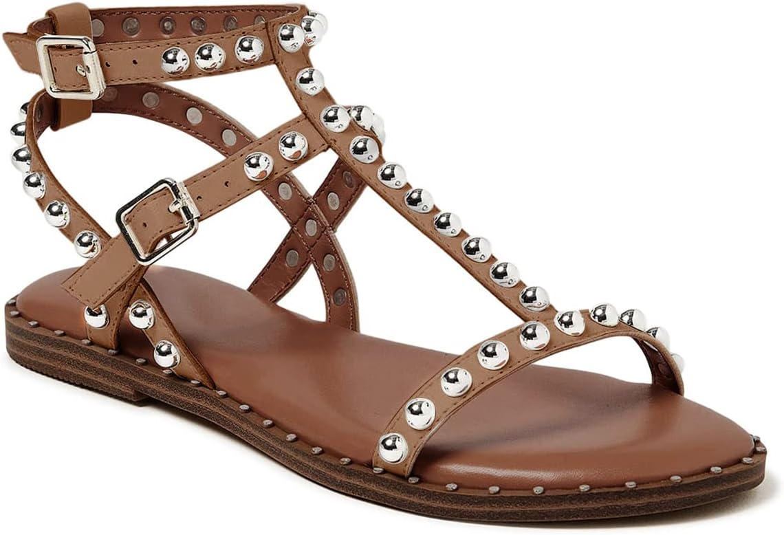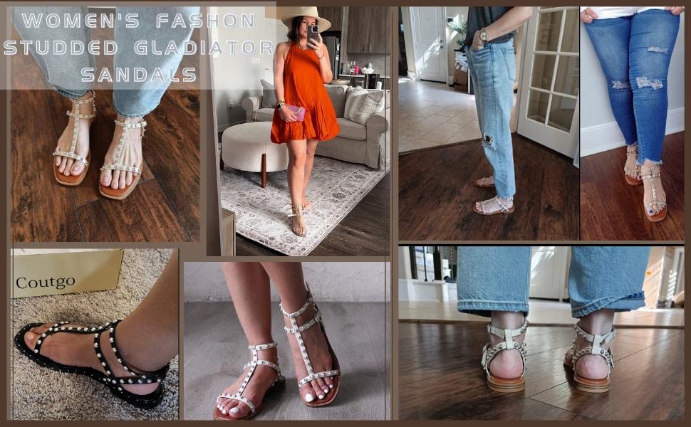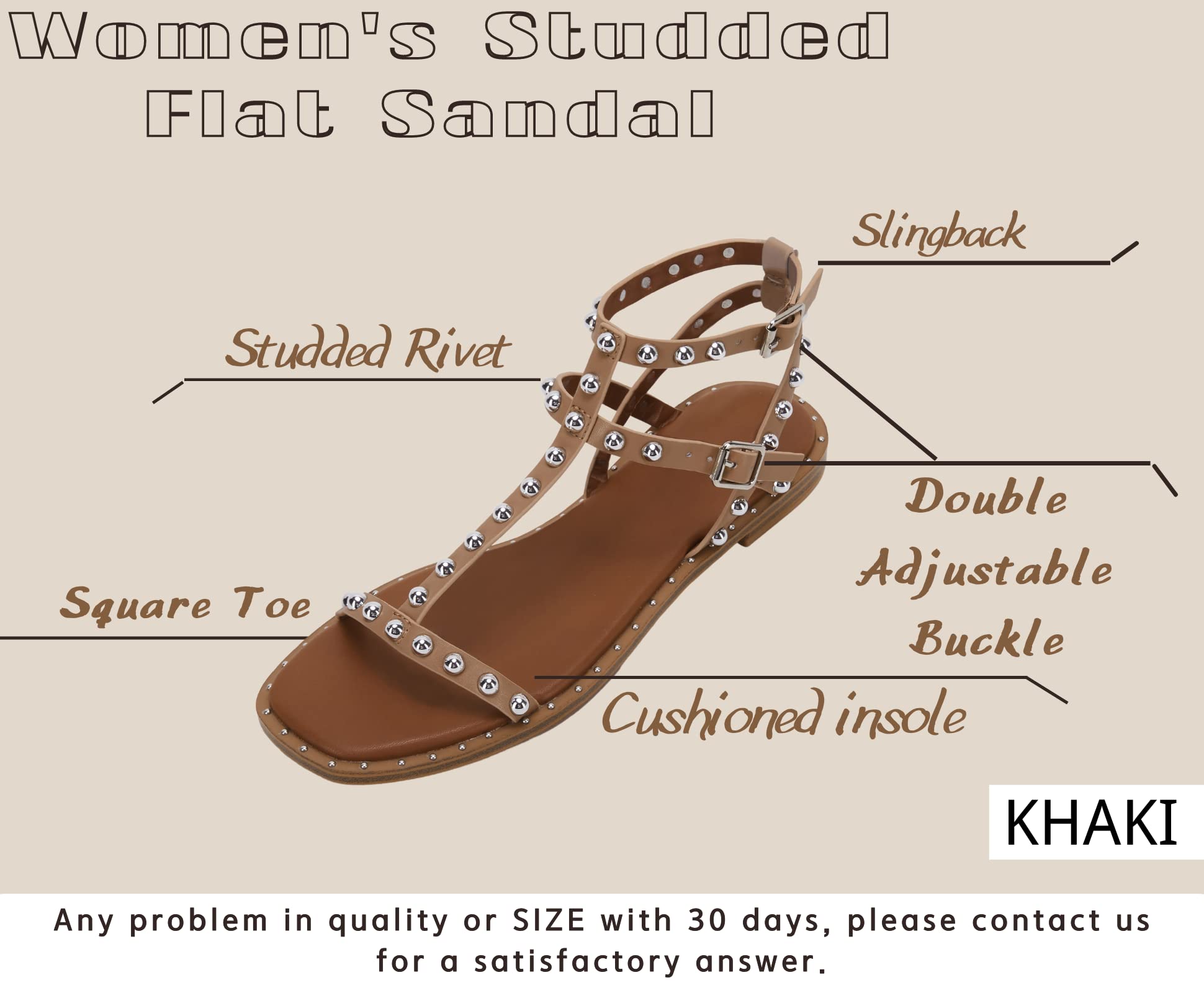SIZE: 39 - Coutgo Womens Strappy Gladiator Flat Sandal Square Open Toe Studded T Strap Rivet Slingback Buckle Beach Sandals