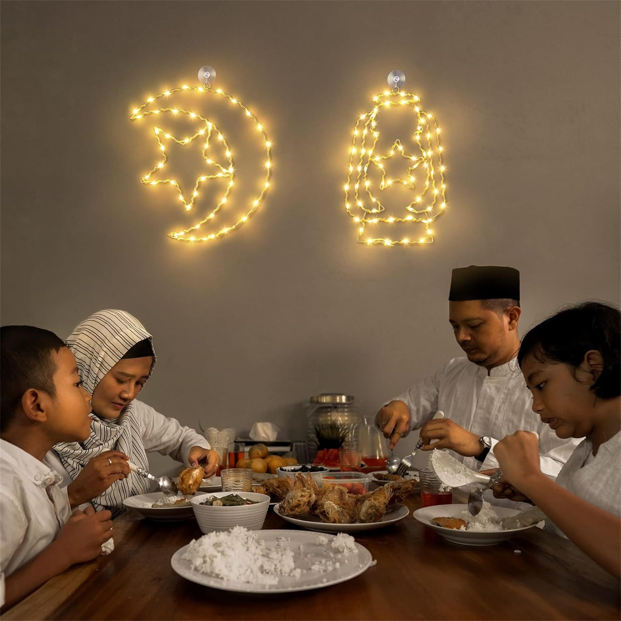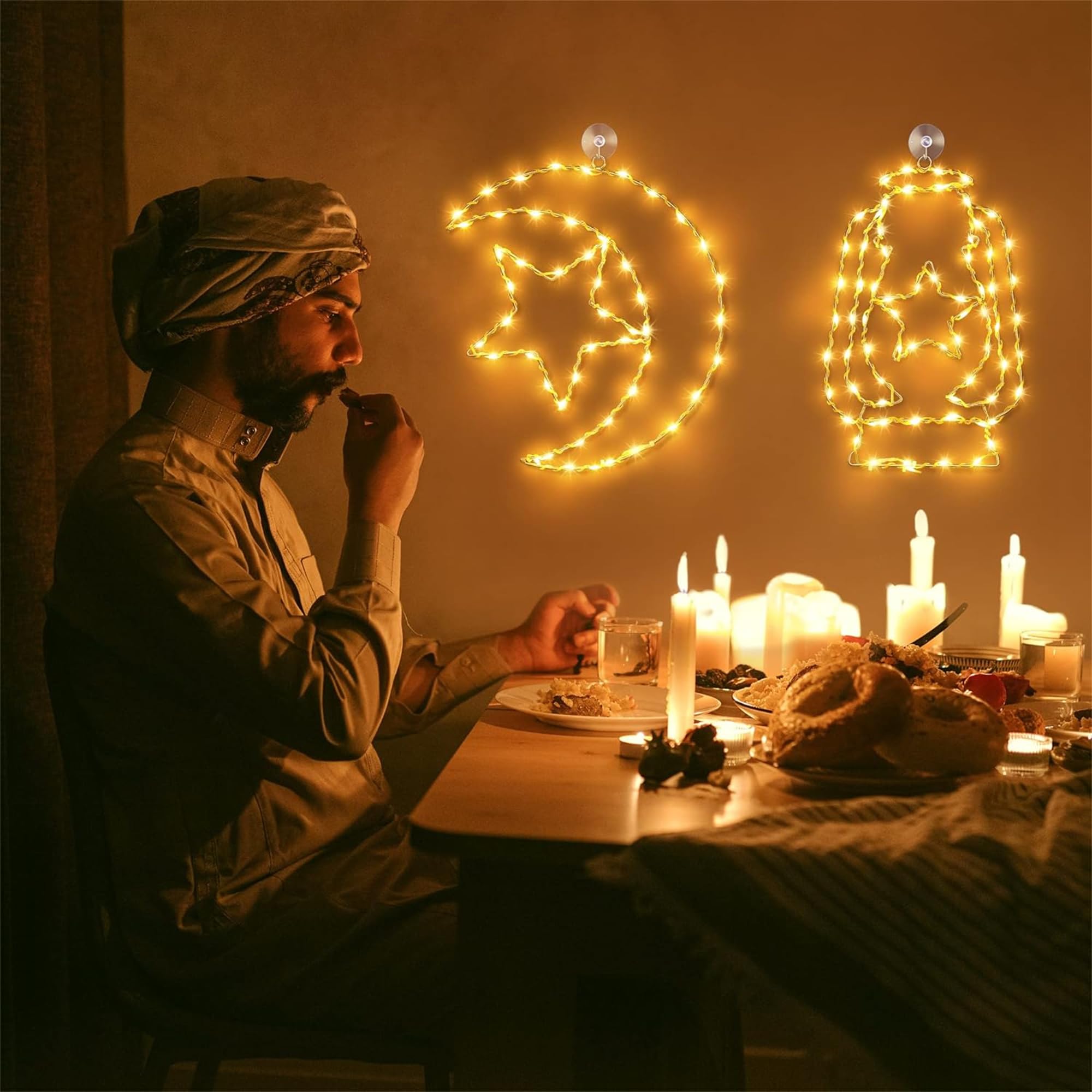 - Package Includes: 1 piece of star moon shape Ramadan Mubarak; 1 piece of candle lantern shape Ramadan Mubarak; 2 piece of suction cups; 2 piece of remote control