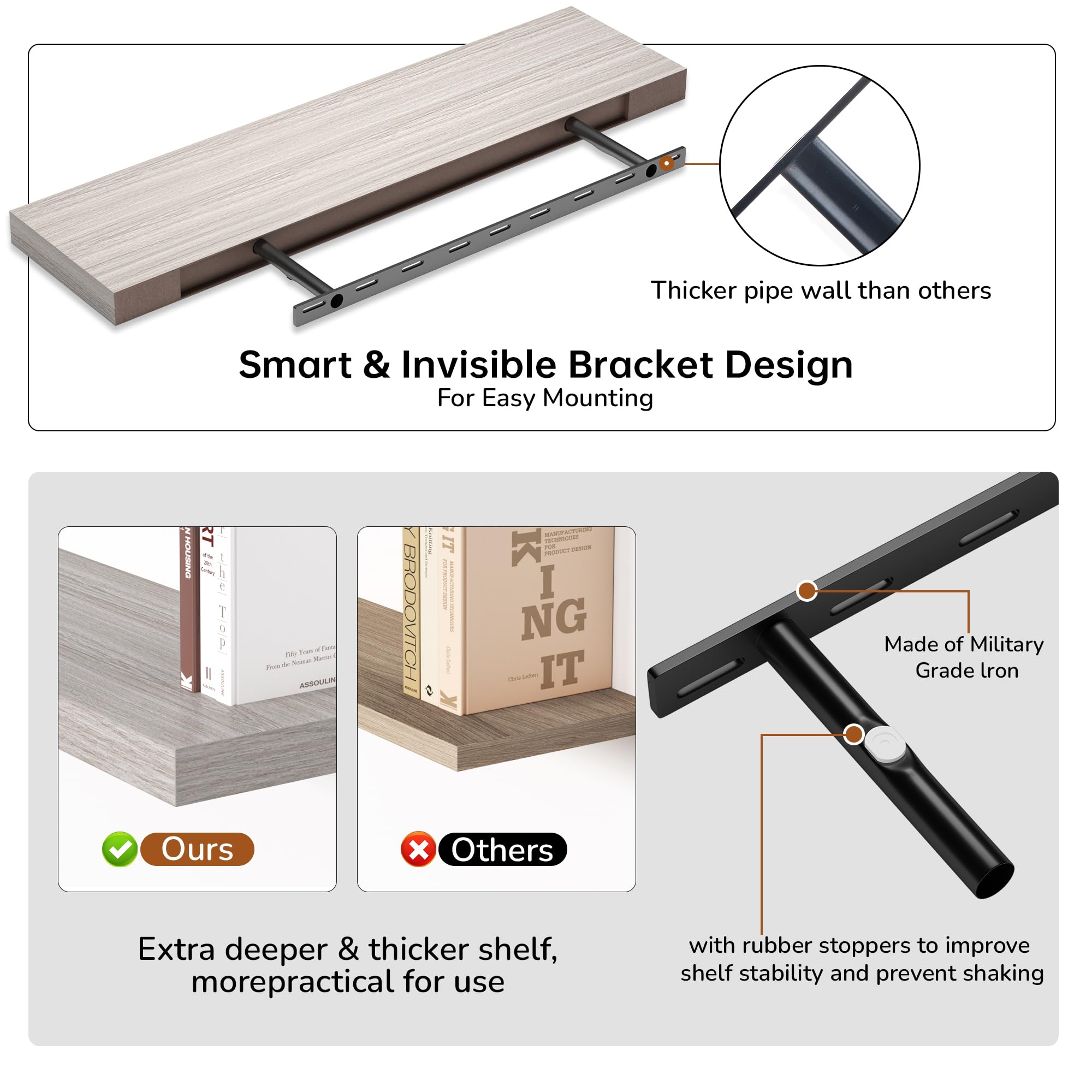 - Easy To Assemble - This floating shelves come with stainless-steel galvanized invisible brackets, toggle bolts for drywall & a simple instruction manual to help you install. The assembly of this wall shelf is very simple, only two boards and some necessary screws and other hardware, and we also have detailed instructions for you to view, you can assemble quickly. Please contact our product support team when you have any questions.