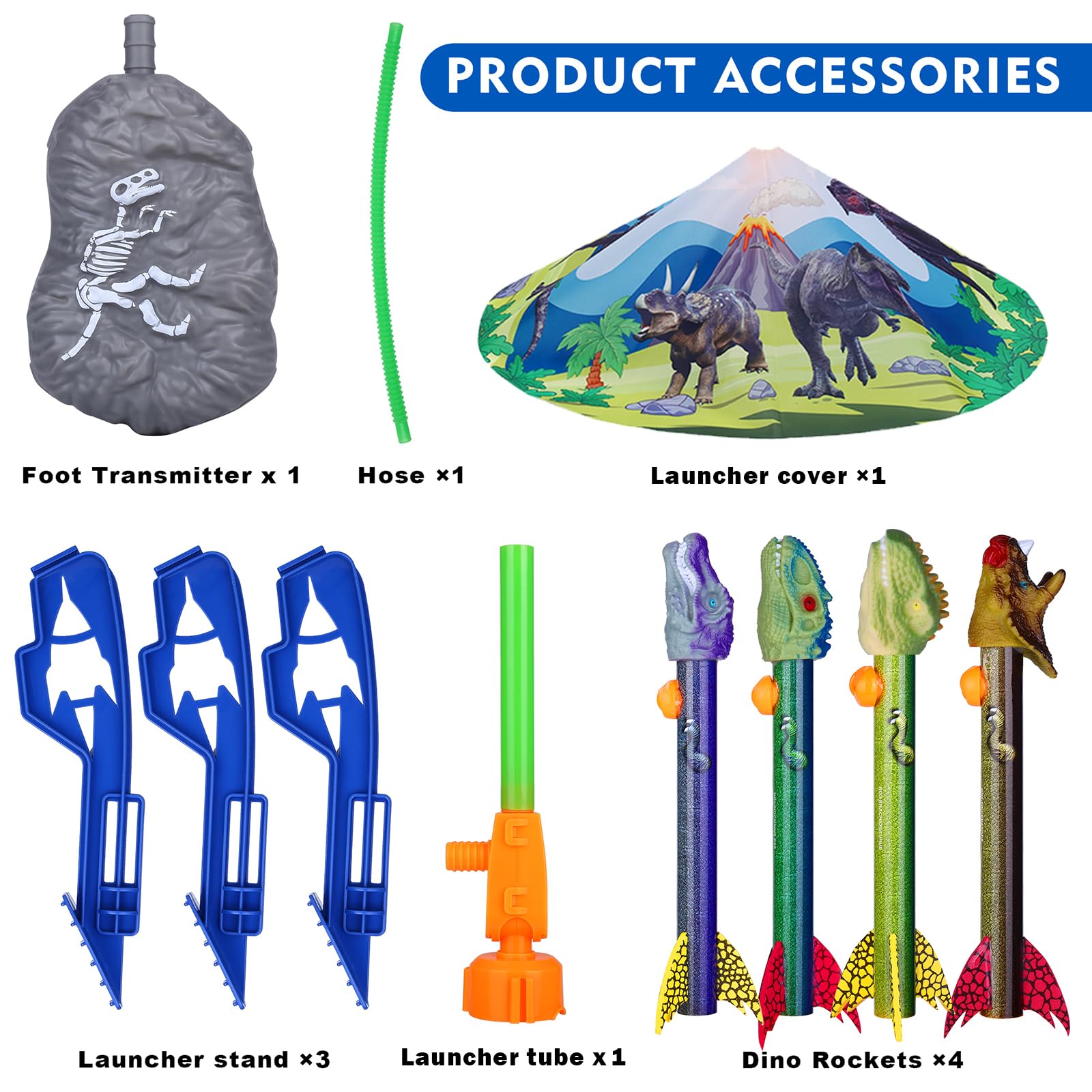 - Toy Rocket Launcher for Kids: This rocket launcher set includes 4 foam multi-color dino rockets, 1 step pad, 1 launch stand with an adjustable launch tube. Kids can have hours of fun just by running, jumping and stepping. Very suitable for boys age 3+