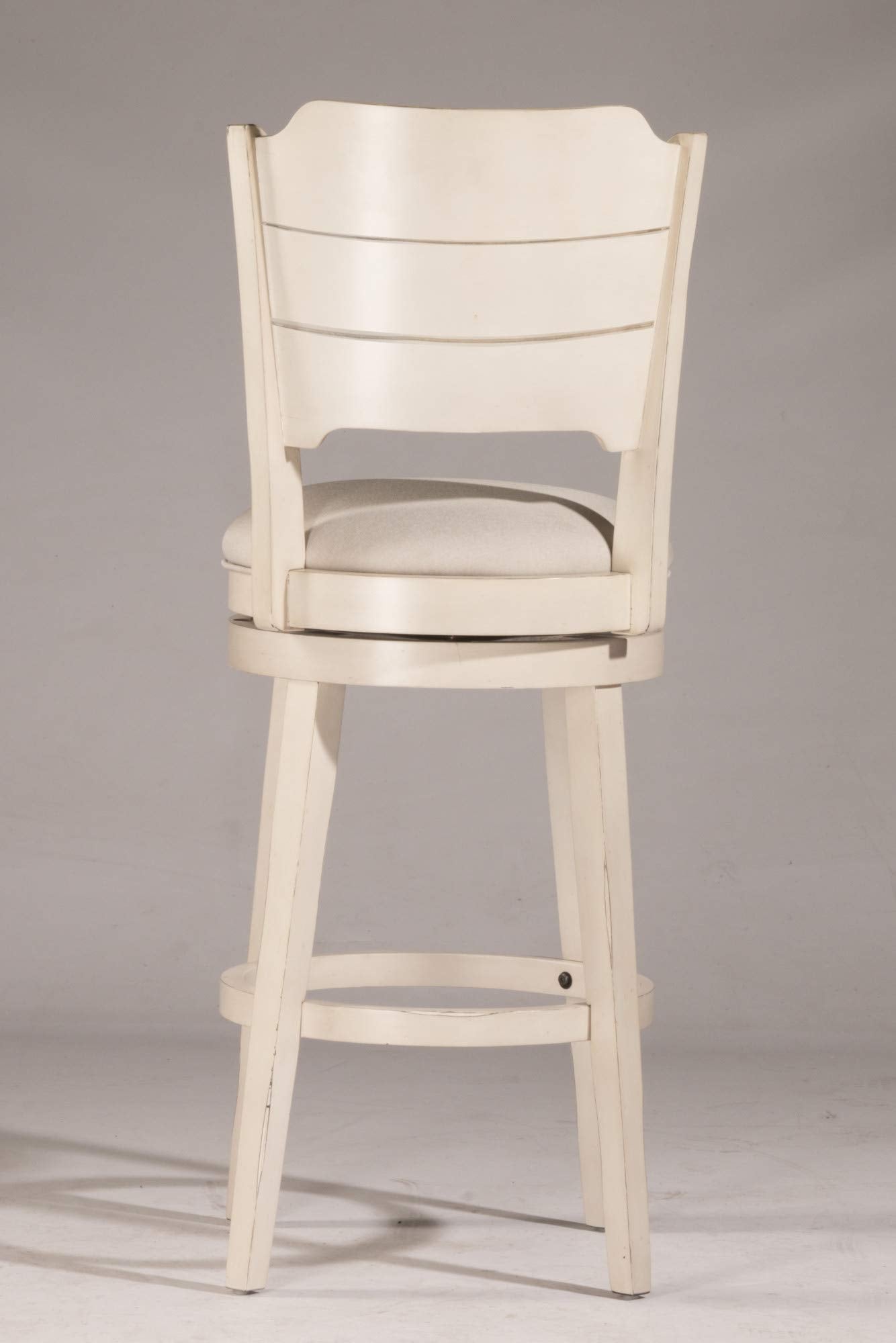 Details: Unobtrusive to a wide range of stylistic themes from rustic farmhouse to coastal or traditional, this bar-height swivel stool is a charming piece to your home.The ship-slat back and distressed sea white wooden finish come together to create a comforting country feel while also providing a modern touch to your space. The Fog Gray upholstery completes this piece with a light and breezy contrast. The proportionate footrest, high back, and 360 degree swivel feature make this stool a functional and comfortable addition to any counter-space without compromising your personal style. Assembly required.