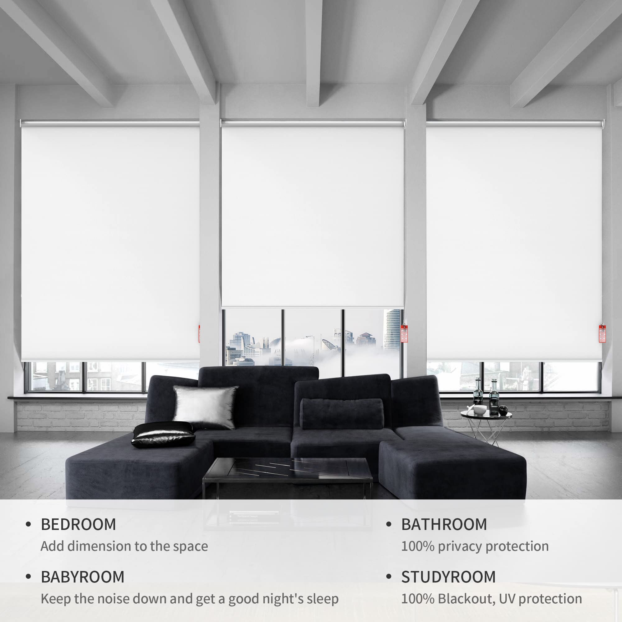 - 100% BLACKOUT SHADES:100% Blackout,UV ray block,Waterproff,Noise Reduction. Good privacy protection. 100% Polyester+Reinforce Thermal Insulated Coating,Insulated roller shades that prevent heat or cold from entering.