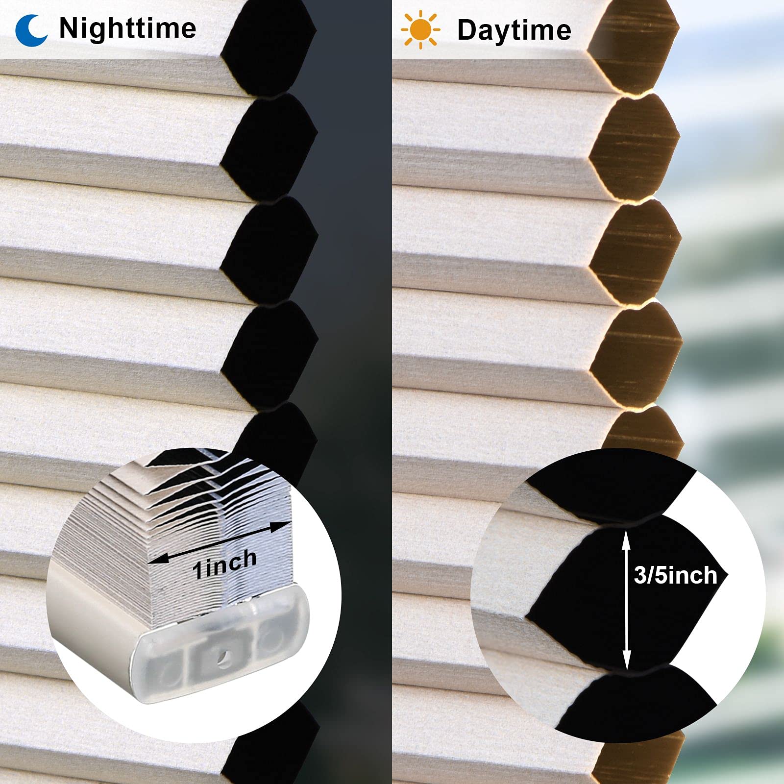- Non-sagging 3/5'' cell structure not only provides a uniform appearance, but also insulate your home against outside thermal energy in summer and keeps outside cold away from your warm house in winter. Also, our curtains can reduce the noise from outside to provide you a better environment to work or sleep.