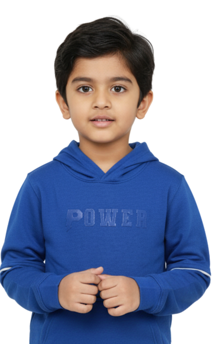 Design: Vibrant solid electric blue color with a tonal (same-color) graphic and sporty white piping detail on the sleeves. Graphic: Features a large, embossed or subtle "POWER" text graphic on the chest. Comfort: Warm, soft interior fleece for all-day coziness. Fit: Standard youth fit with an attached hood and kangaroo pocket.