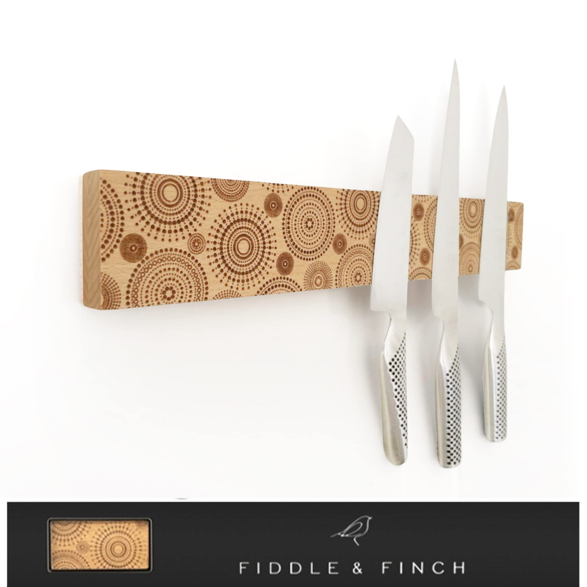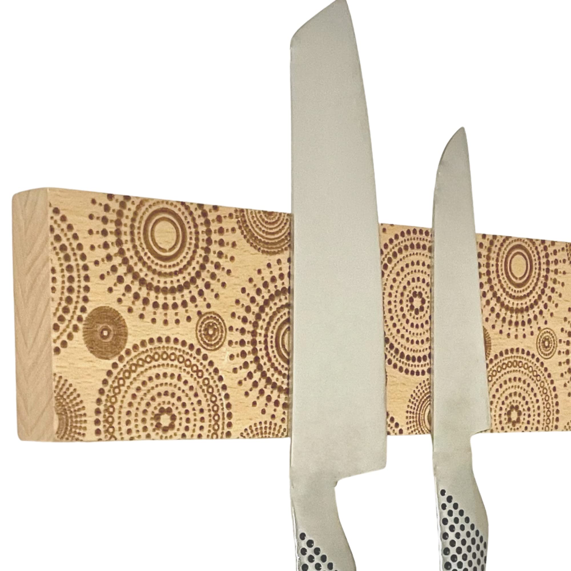 - < Attractive Addition > Our beautifully designed, construted knife holder will add a finishing touch to your space with its laser etched pattern on beechwood. With steel plated reinforced hanging slots our magnetic knife bars will be guaranteed to avoid sagging and slipping over time. Enclosed in a well presented, sleek box makes it the ideal gift for all occasions whether it be a house warming, birthday, wedding or anniversary.