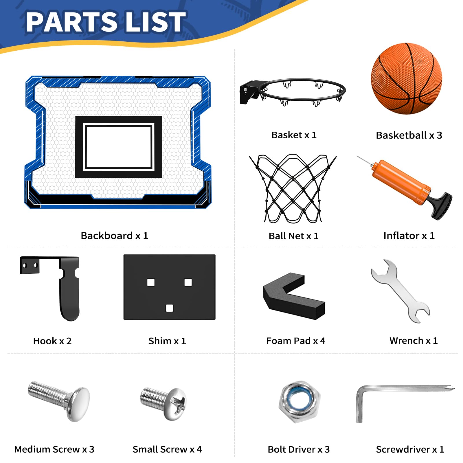 - [Shock Proof]- Don't worry about affecting your neighbors! Indoor basketball hoop comes with 4 highly elastic shock-proof sponge corner pads, which can reduce the vibration and noise when shooting, protect the door frame. Let's enjoy playing basketball!