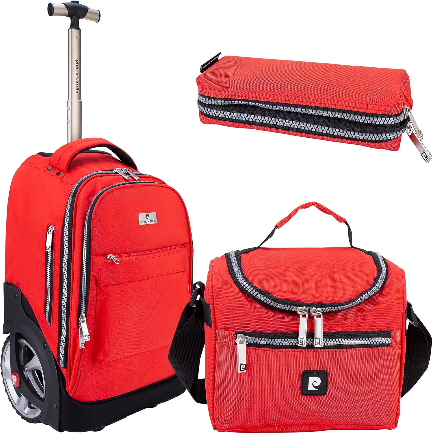 Pierre Cardin Trolley backpack School bag 3 PCS set All in One 2 BIG WHEEL Rolling Backpack Include Pencil case, Lunch bag and trolley backpack UNISEX (PC87067-Red)