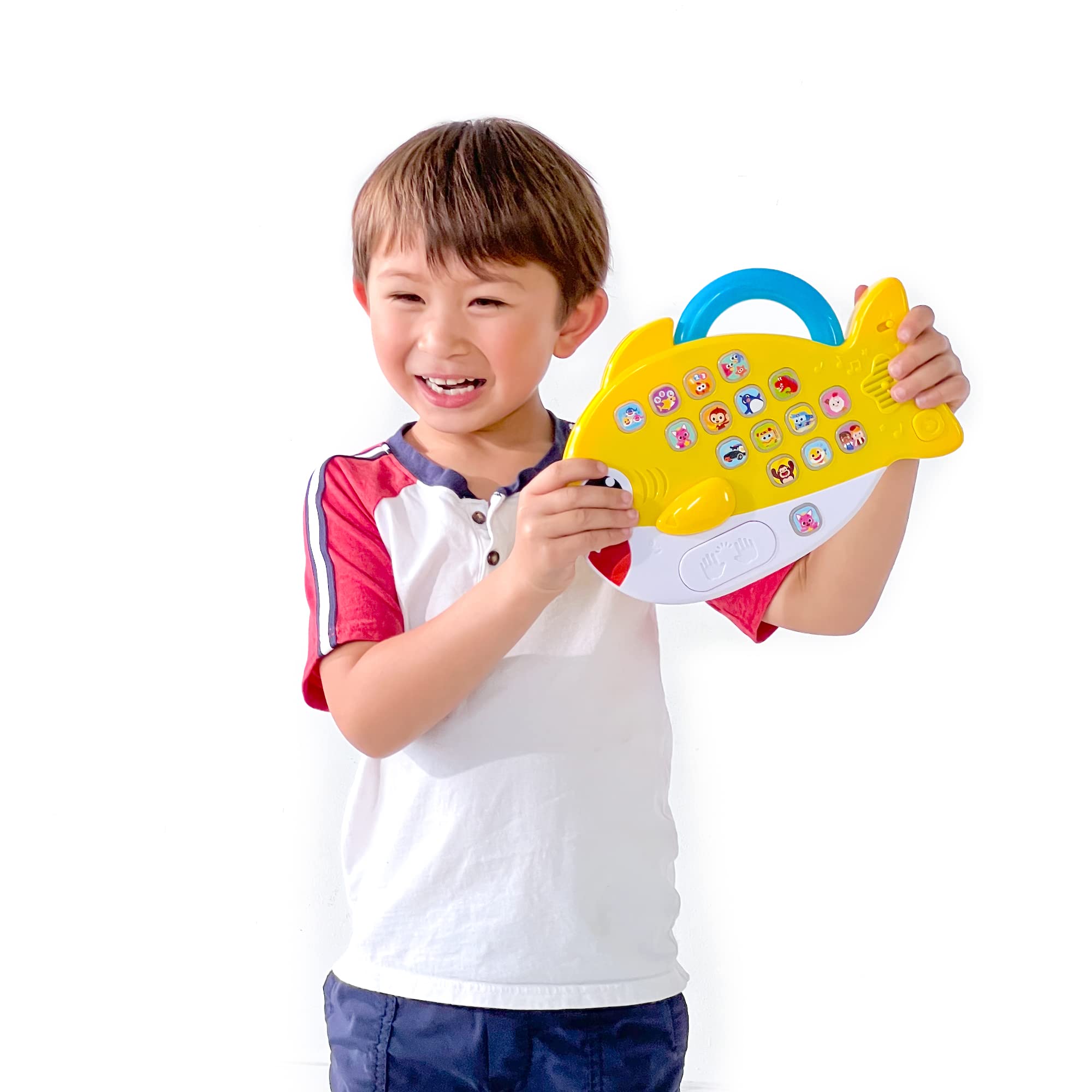 - OFFICIAL PINKFONG BABY SHARK EDUCATIONAL TOY that plays the iconic Baby Shark song (doo doo doo doo doo)! Enjoy 16 circular buttons that plays fun tunes and Pinkfong's commentary sounds, 1 autoplay button to play full playlist, as well as a hands button to play with 3 different sound effects that can be altered by moving Baby Shark's fin. Features a blue handle that that lights up to each song for kids to have a tactile experience as well as carry the sound toy wherever they go!