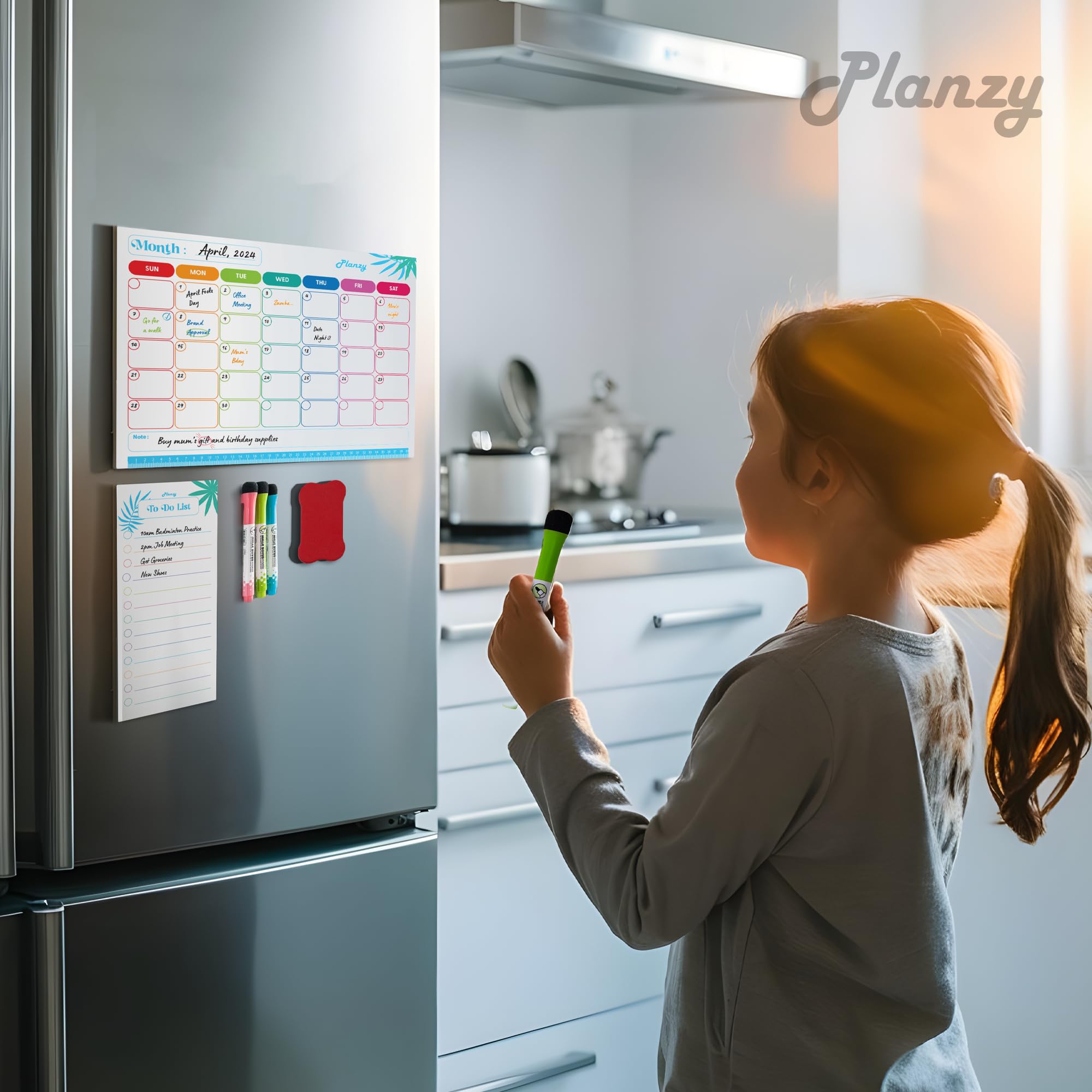 Introducing Planzy Magnetic Calendar for Fridge - the perfect dry erase calendar to bring order and organization to your life. This premium 16.7"x12.6" fridge calendar is designed with an extra-thick magnetic surface that can easily be attached to your refrigerator, making it a great addition to any kitchen, office or classroom. Its dry erase feature makes it incredibly easy to use, allowing you to plan ahead while also tracking your progress. The kit includes 1 monthly planner, 1 To Do list, 5 Fine Tip Markers and 1 Eraser so you have everything you need for a successful planning session! Never miss an important date again with Planzy Magnetic Calendar for Fridge!