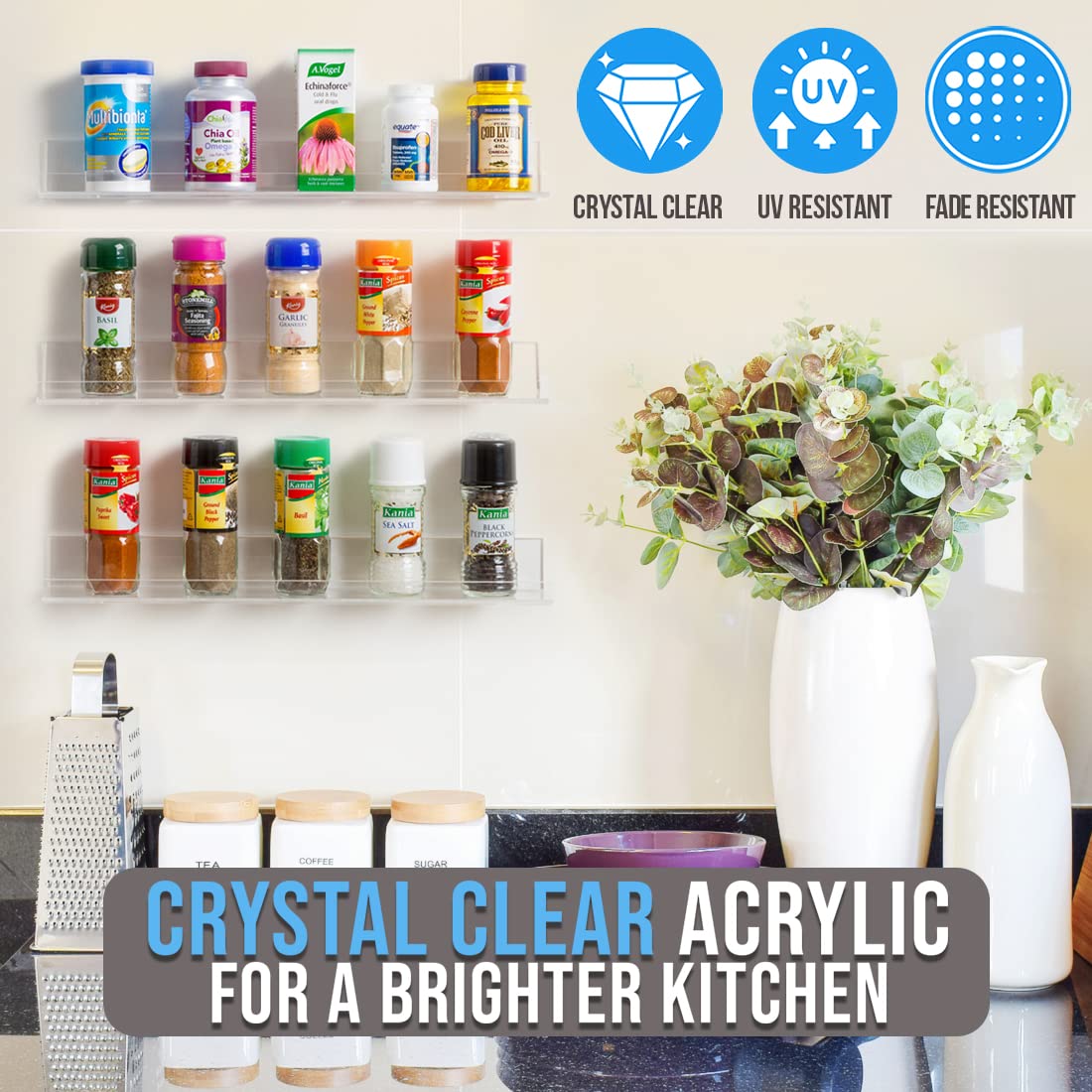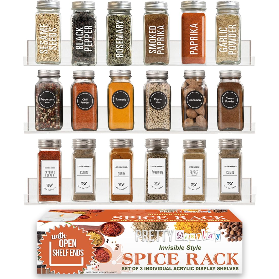 The Pretty Display Acrylic Spice Rack lets you take back your precious countertop space, is easy to install, and looks awesome!