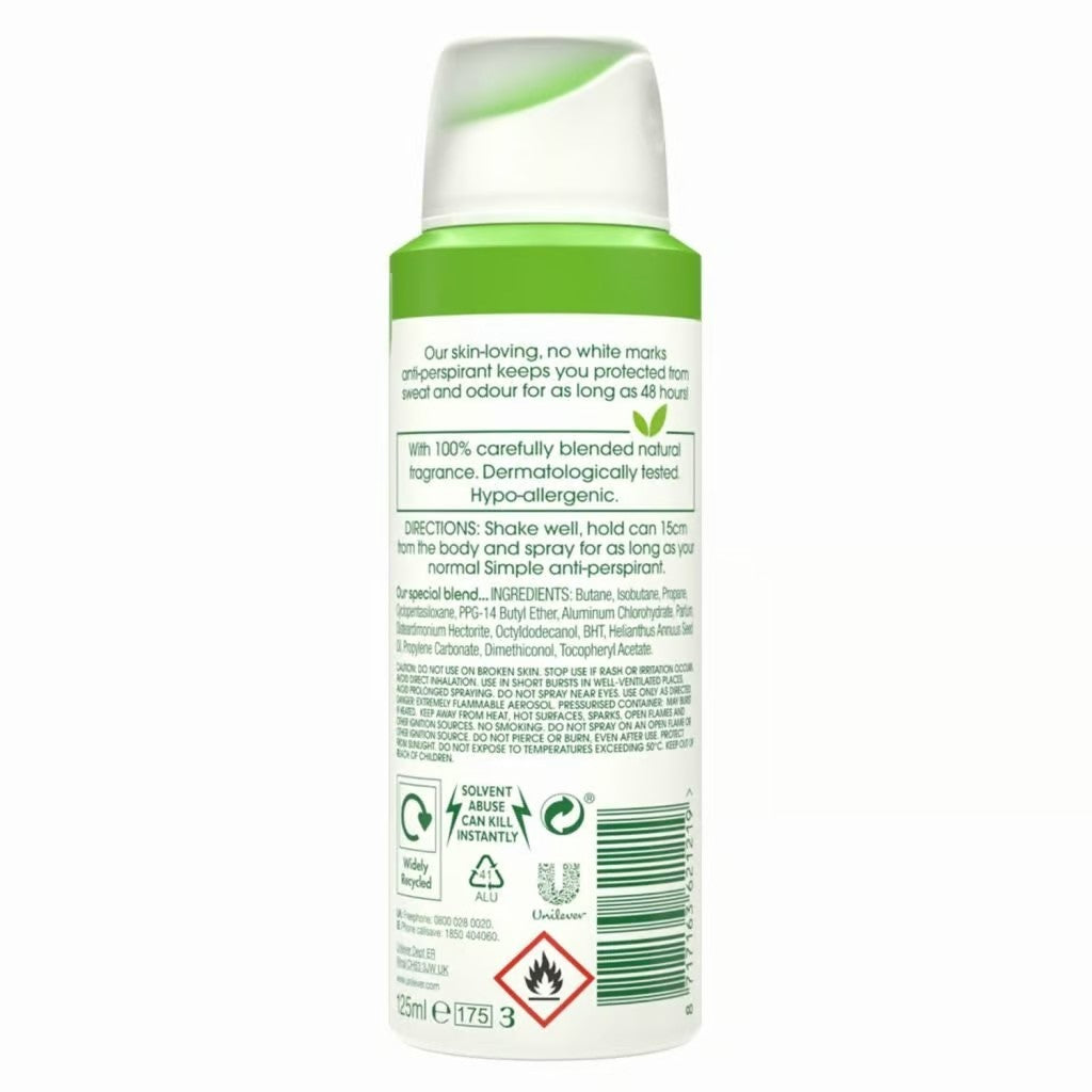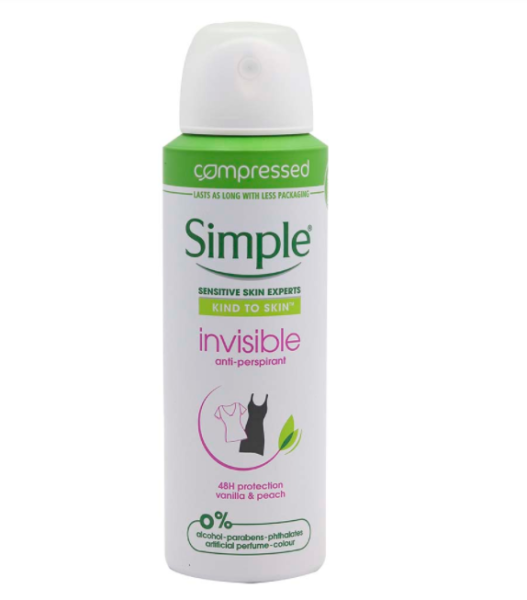 Stay fresh and confident all day with Simple Invisible 48H Protection Anti-Perspirant. This gentle yet effective 125ml spray provides invisible and long-lasting protection against sweat and odor. Dermatologically tested and free from harsh chemicals, it's perfect for sensitive skin. Trust Simple to keep you feeling clean and fresh for up to 48 hours.