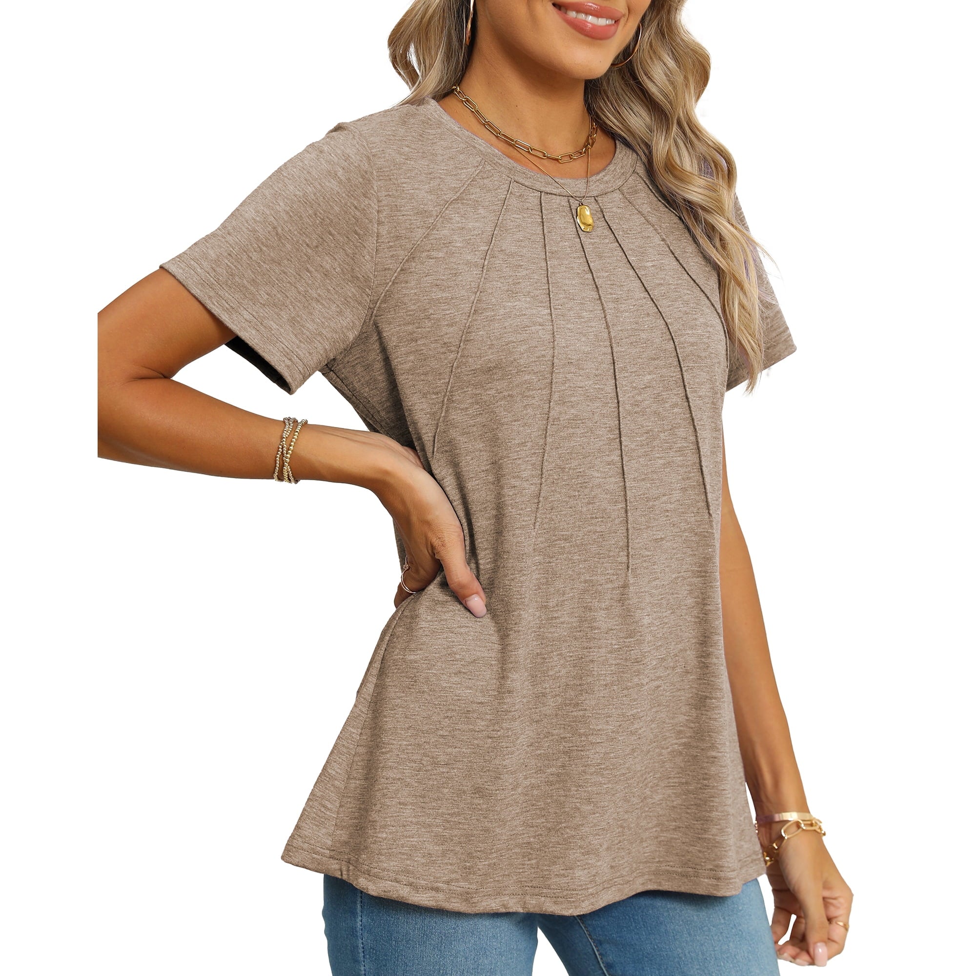 SIZE: M - Rosvigor Blouses for Women Short Sleeve Shirts Casual Dressy Summer Tops with Pleats