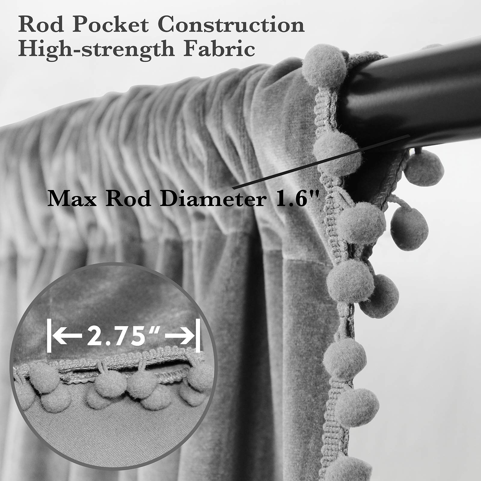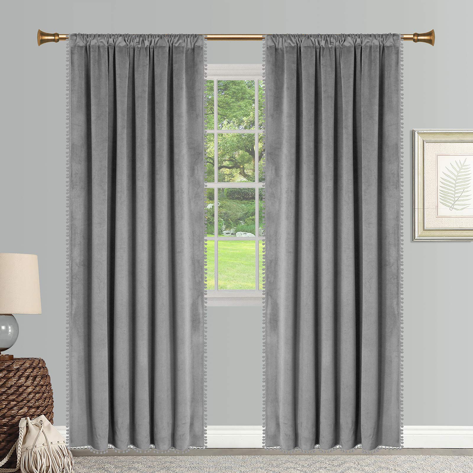 - Package Includes: 2 grey pom pom soft velvet curtain panels; each curtain panel mesure 106 cm wide by 213 cm length; with 7 cm rod pocket, our velvet drapes can fits most standard rods and makes the maximize coverage of windows