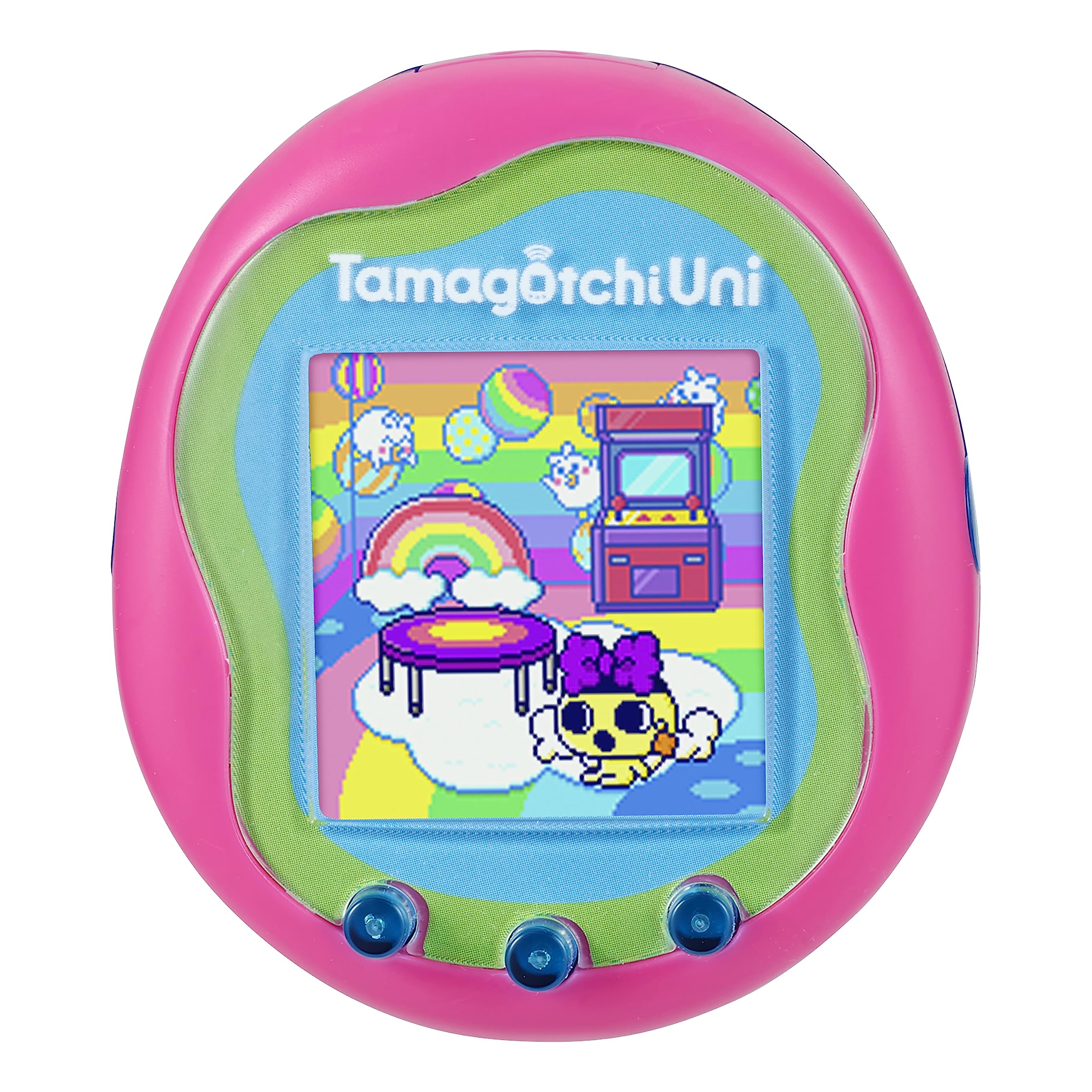Tamagotchi Uni is the newest generation of your favorite interactive virtual pet with a pink shell and allows fans to connect in a completely new way – the Tamaverse! The Tamaverse is the metaverse of the Tamagotchi world allowing fans from around the globe to play together in the Tama Arena, Tama Party, Tama Fashion and Tama Travel! While maintaining its core Tamagotchi attributes of nurturing, communication, portability, and gaming, your virtual pet is better than ever – it’s more Unique, United and Universal! Tamagotchi Uni also has various new features allowing fans their own unique experience, including DIY activities, exploring with your character and an in-device social platform. You can connect with your friend’s Tamagotchi Uni to go on playdates, give and receive gifts and even marry! Plus, the Tamagotchi Uni comes with a pink band so you can wear it on your wrist to take it wherever you go and interact with your UniTama in an all-new way! Comes with a rechargeable battery and USB-C cord. Ages 6+