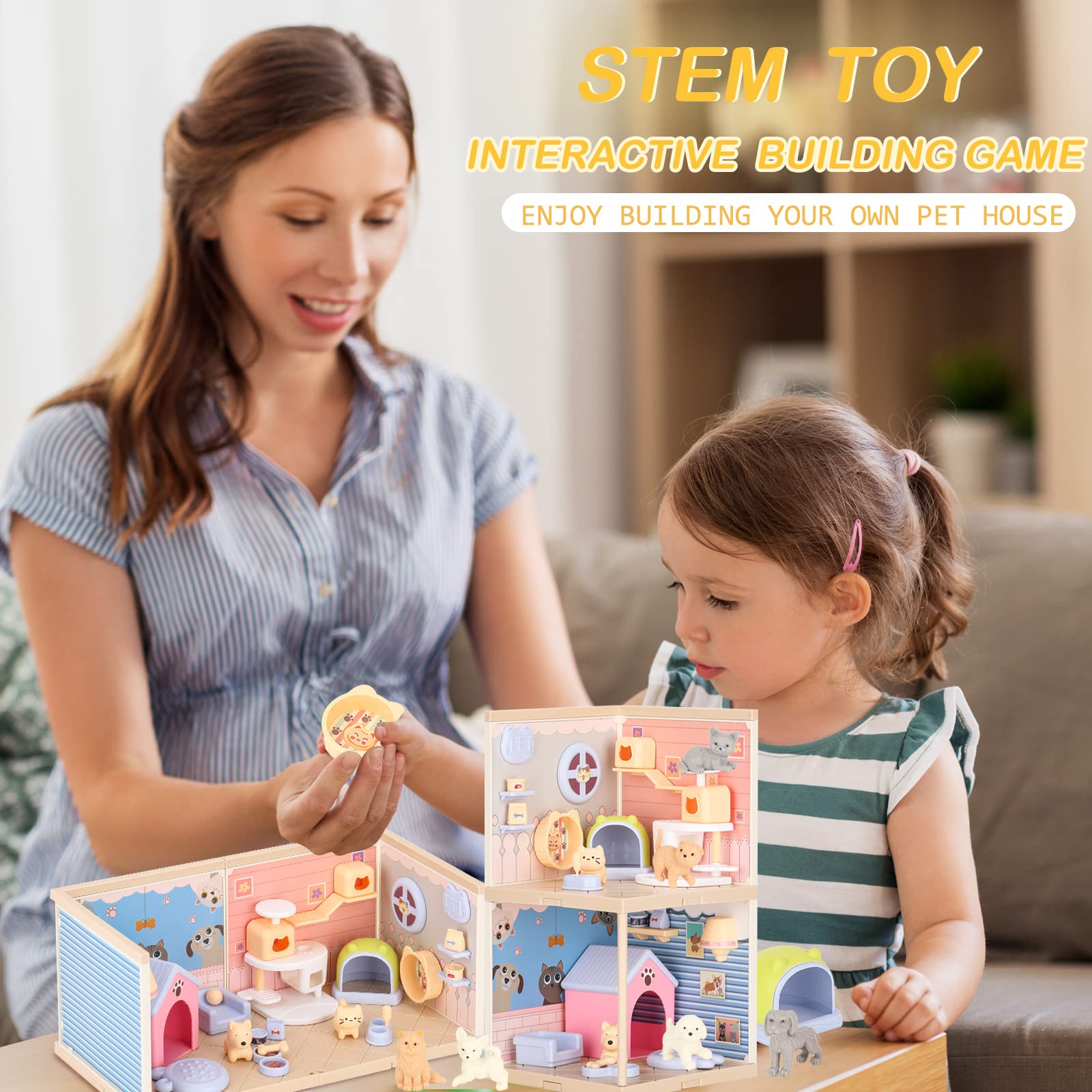 - GREAT STEM TOYS FOR KIDS: Through our pet dollhouse set to improve boys' and girls' STEM learning skills, promote preschool kids to practice motor skills and creativity. Our dog and cat house include everything you need to train, exercise, and award your favorite puppies or kittens. This toy set can easily be combined with other toys for greater fun