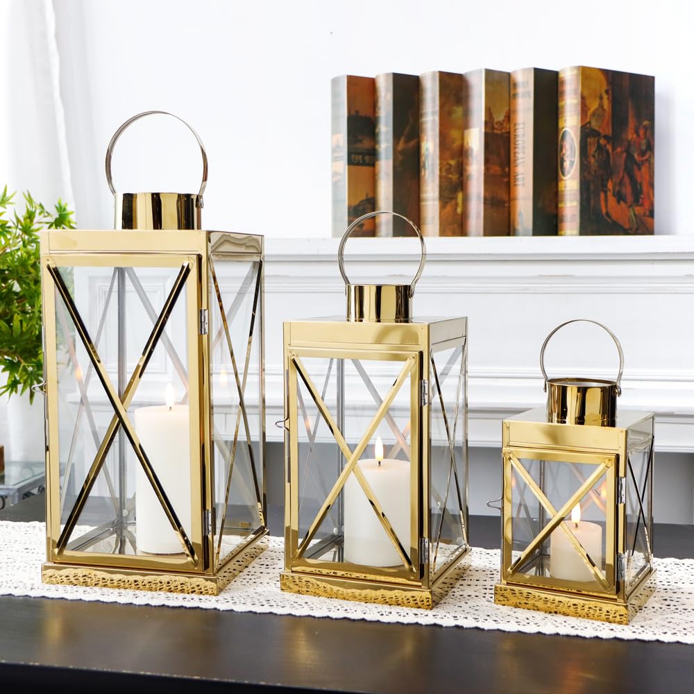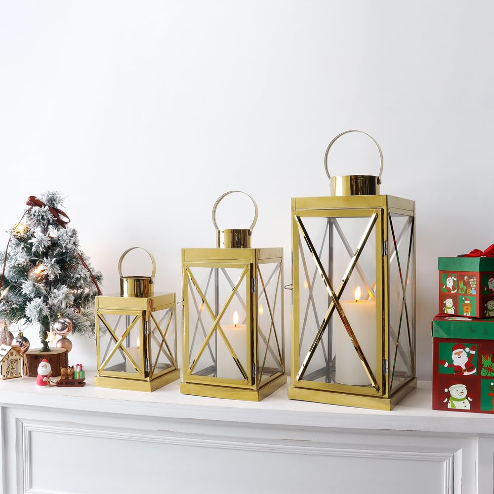 TRIROCKS Gold Stainless Steel Lantern Set of 3-Square Elegance 20 / 30 / 40 cm