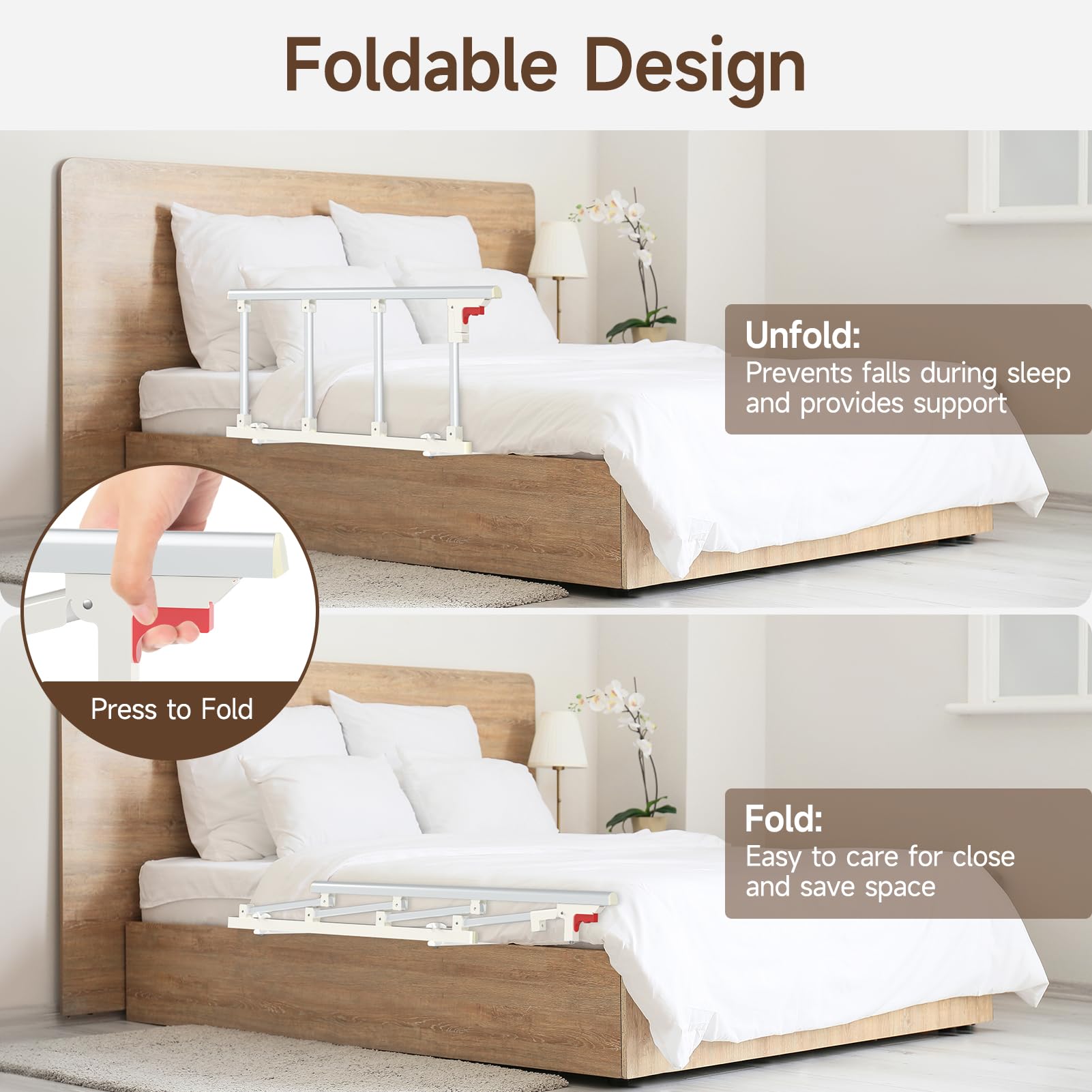 - 【Foldable Design】 The bed safety rail is designed with a press-to-fold mechanism which facilitates intimate care for the elderly or saves space when not in use.