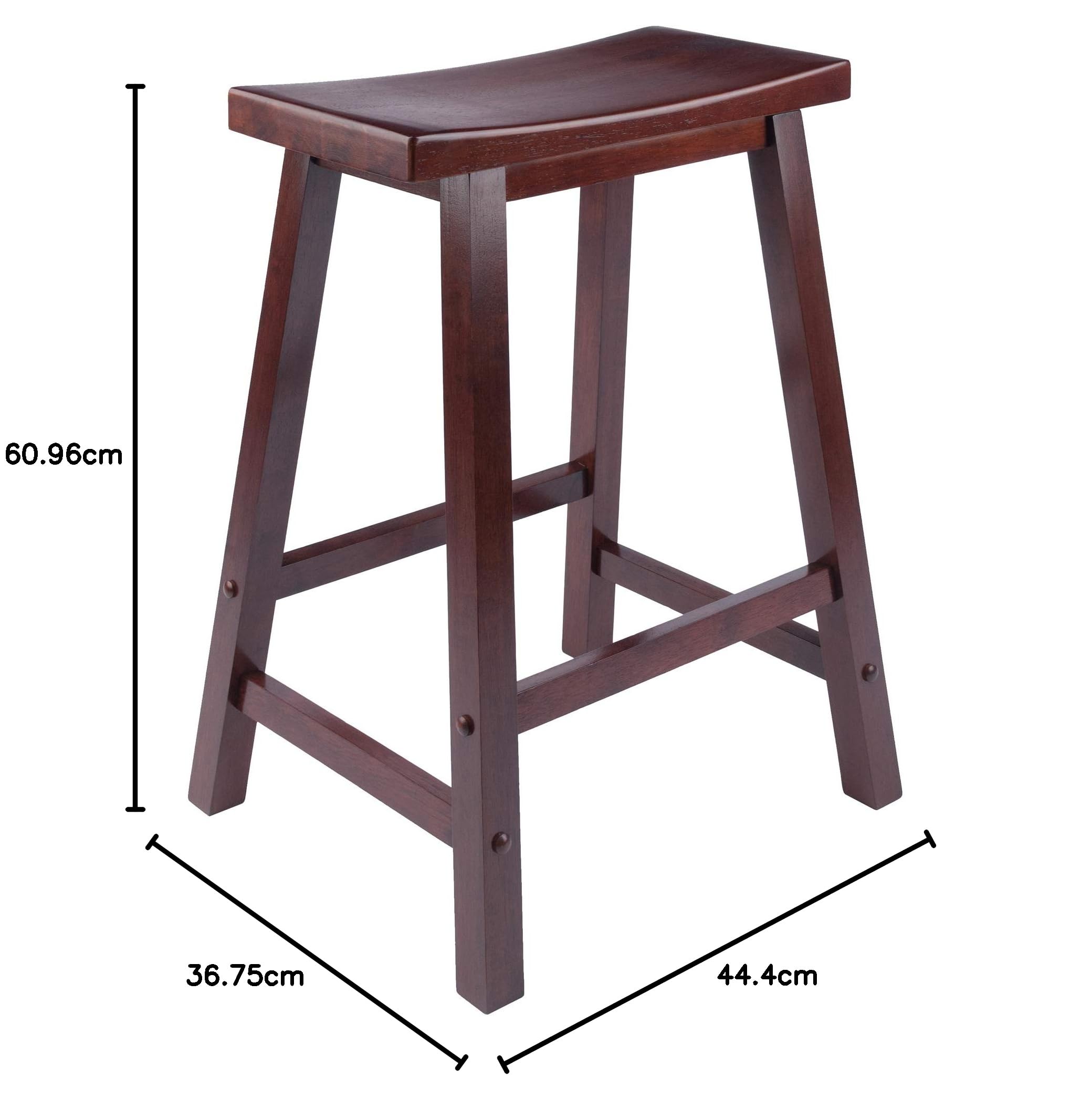 One contemporary Saddle Seat 24" wood counter height stool in Walnut finish. Solid wood construction; designed in the US, produced in Thailand of natural hardwood. Ships ready to assemble with all hardware and tools included. This new style seat is comfortable and sleek.
