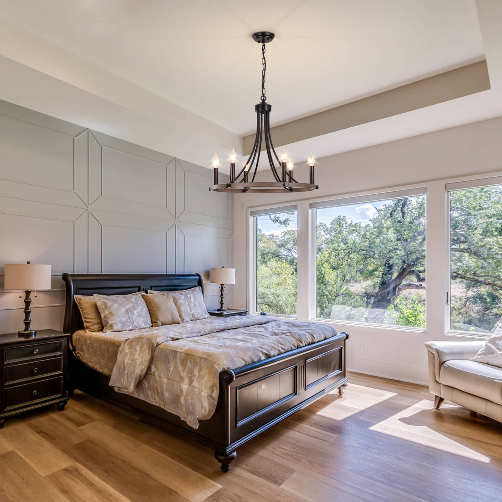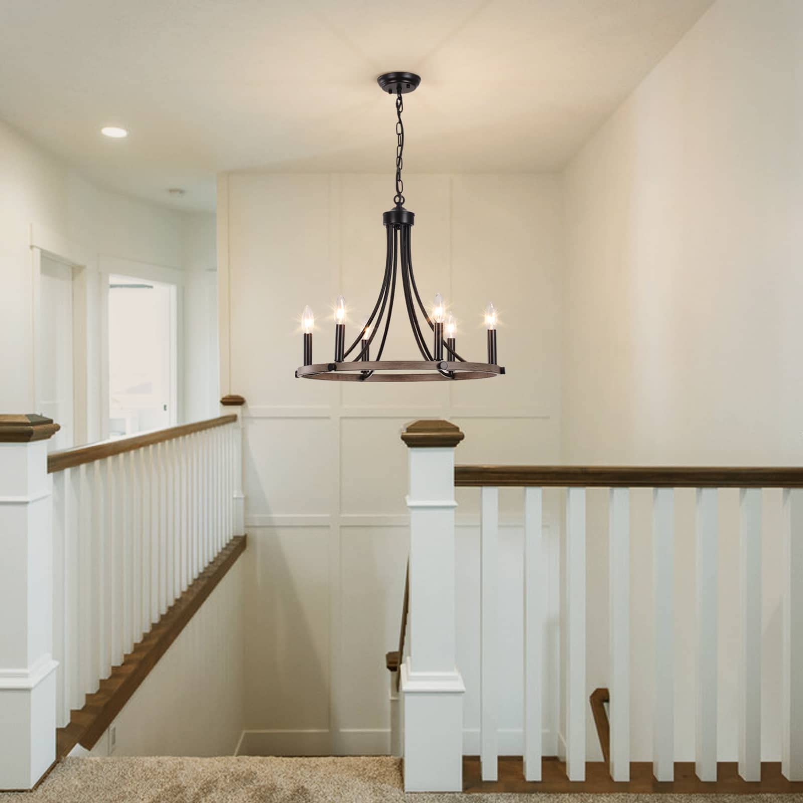 - 💡【Unique Wagon Wheel Chandelier】- Our black farmhouse Chandelier is designed with a unique 6-light wheel shape, it can make your house bright in all directions. The surface of the wheel is similar to wood grain, there is no doubt that it is a symbol of beauty!